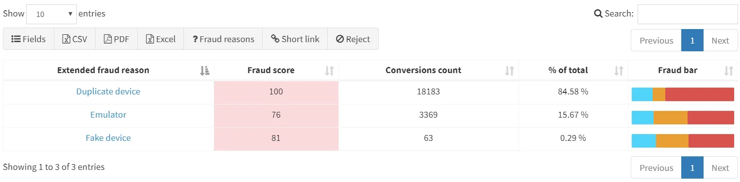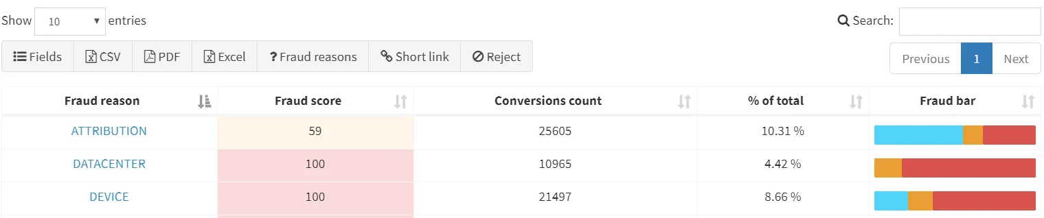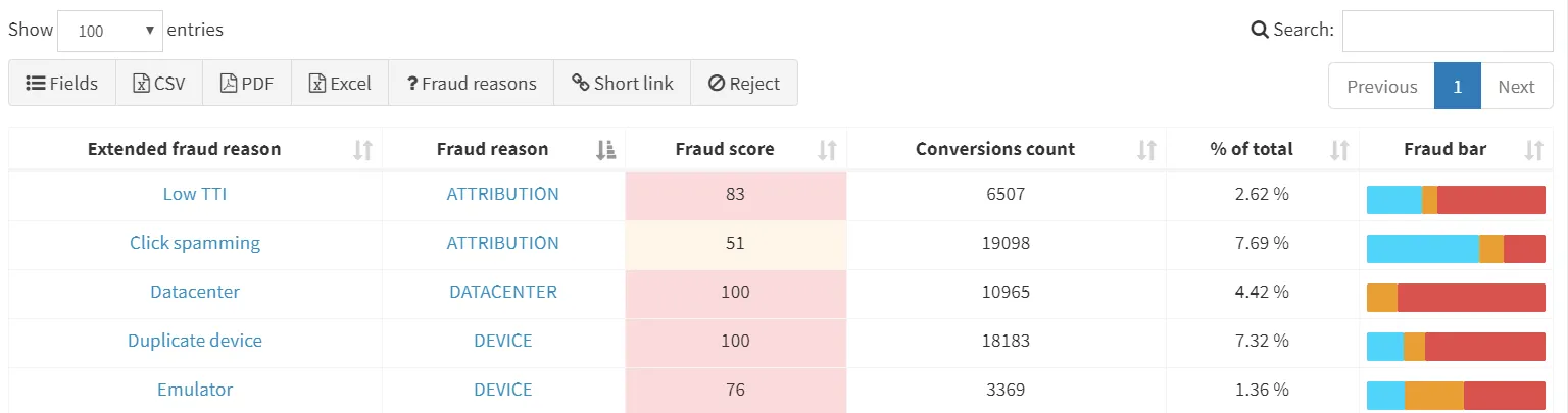 FraudScore использует собственный подход к визуализации фрода: каждой конверсии присваивается fraud score — показатель вероятности мошенничества.