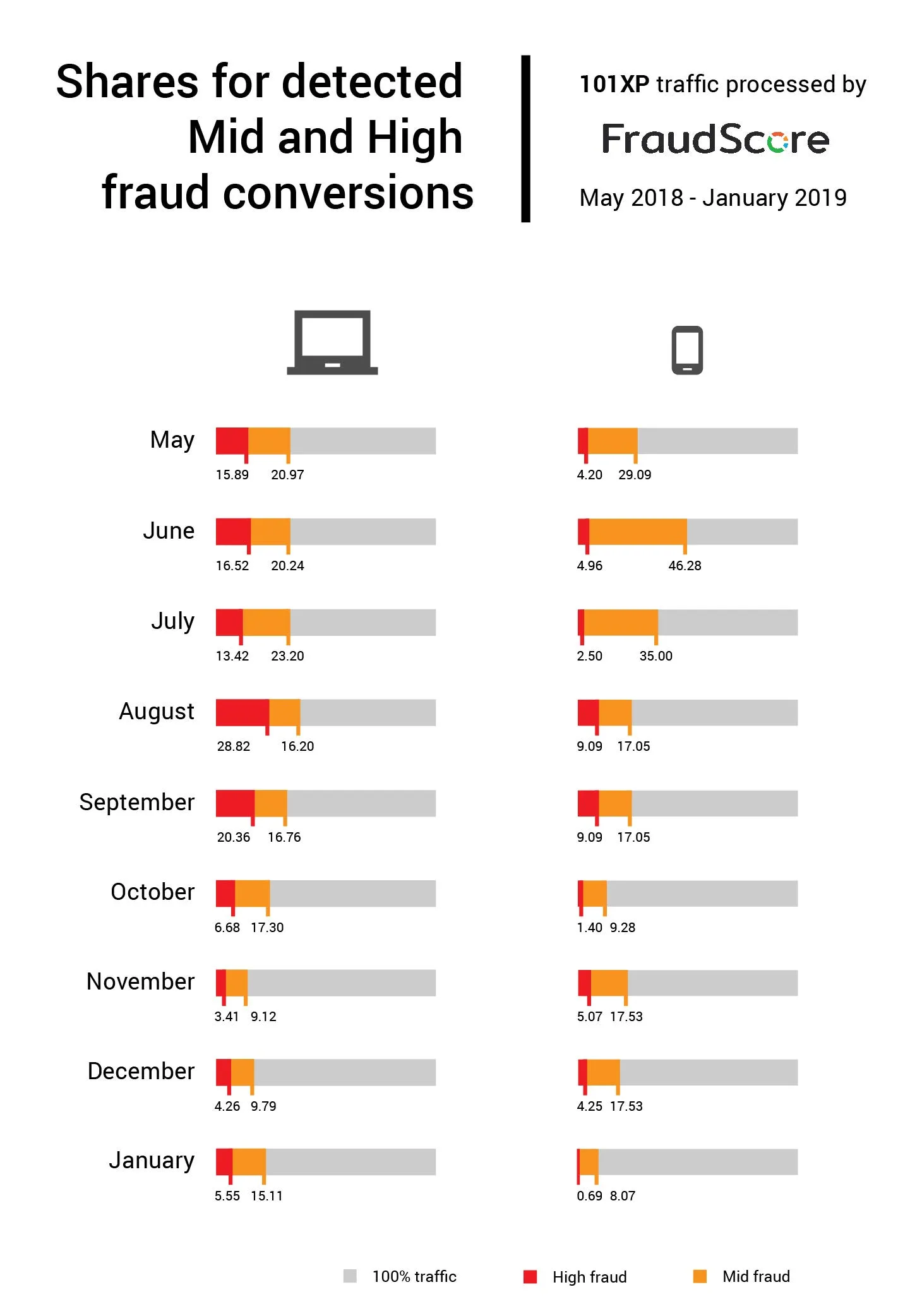 Совместно с дата-сайентистами и менеджерами FraudScore мы провели исследование — подготовили специальные отчёты по качеству трафика и сопоставили их с нашими расходами за период с мая 2018 по конец января 2019.