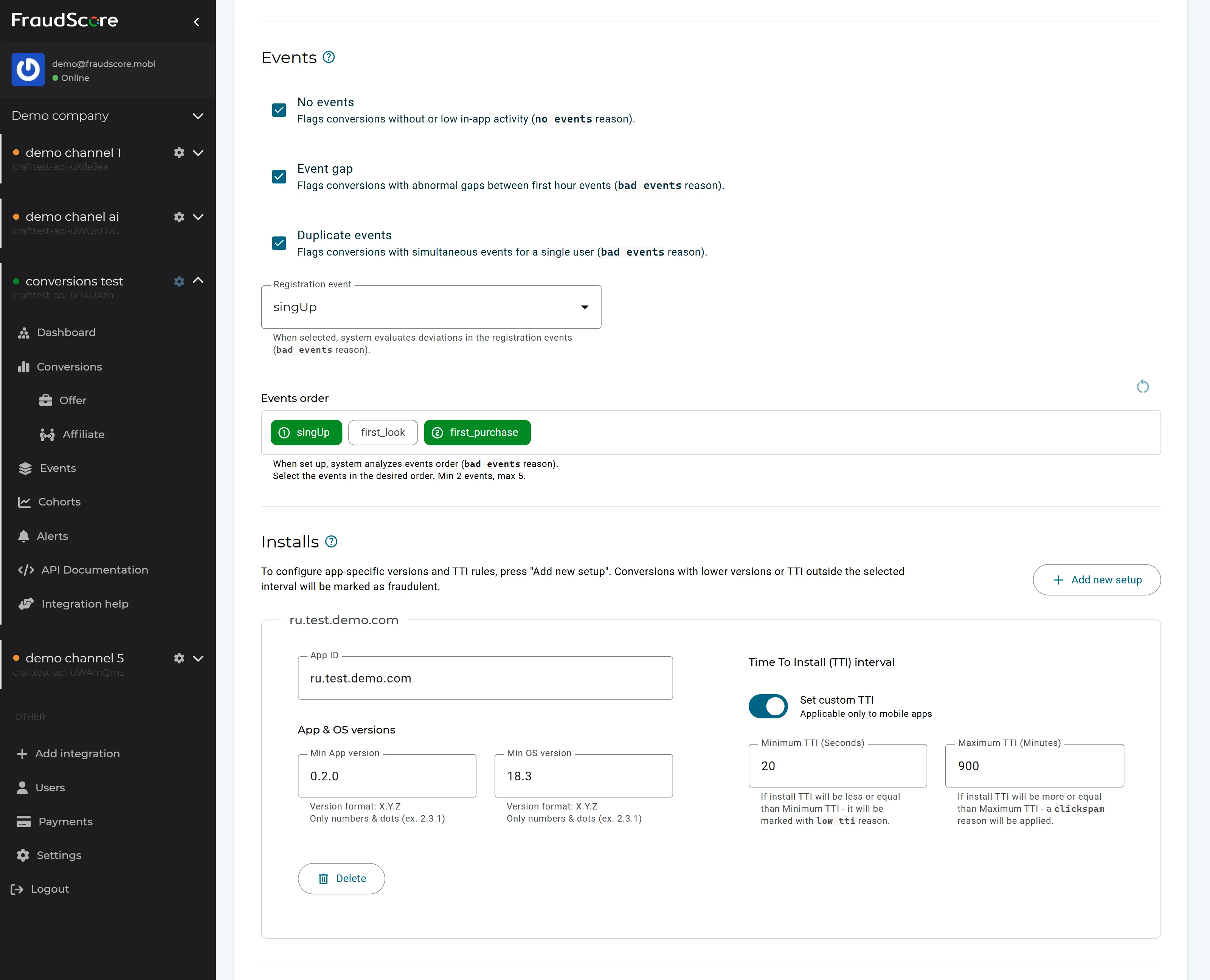 Одним из ключевых обновлений стала возможность задавать минимальную версию приложения, учитываемую при анализе установок и атрибуции фрода. Эта функция особенно полезна для проектов с частыми обновлениями, где важно оперативно исключать устаревшие версии приложения из отчётов и аналитики.