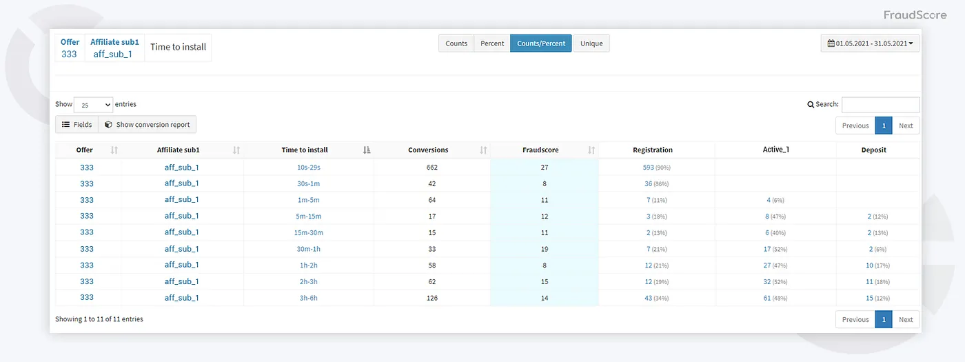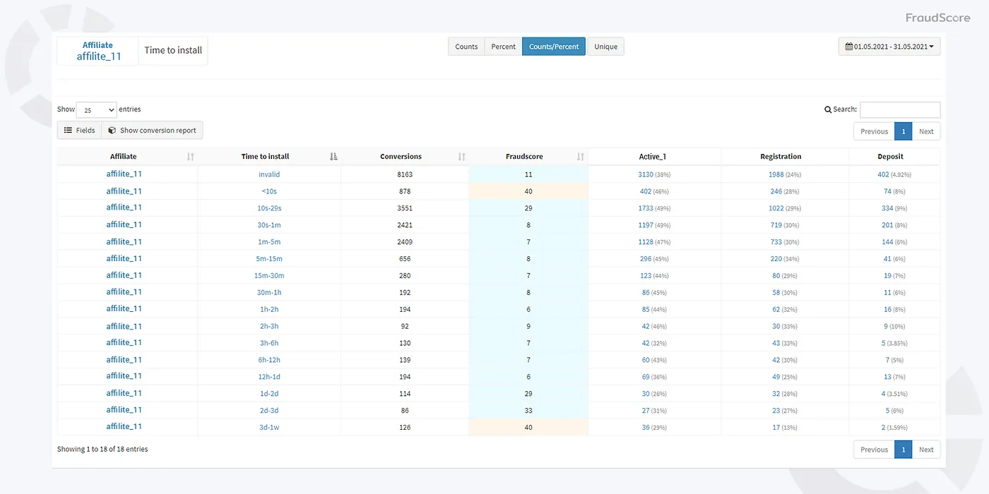 Другой рекламодатель — один аффилиат имел трафик в зеленой и синей зонах (Good Conversions и Low Index Fraud Conversions), но TTI вызывал подозрения — слишком низкий для реального трафика. Команда FraudScore решила изучить подробнее.