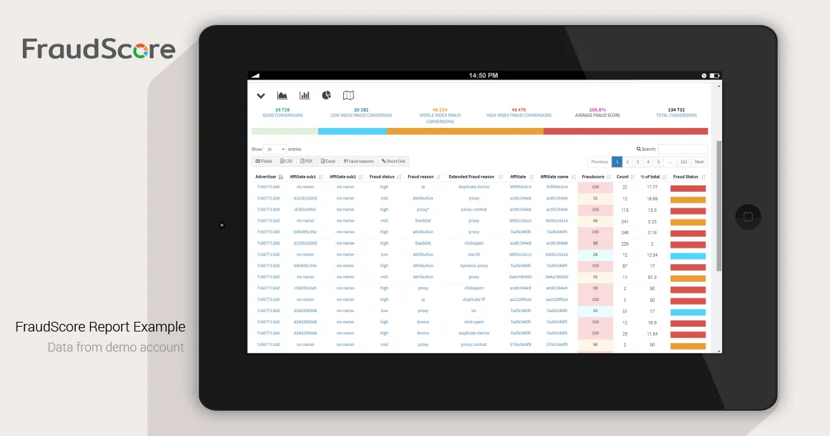 Наш бухгалтерский отдел формирует отчеты FraudScore каждые две недели и передает их команде аффилиатов. В отчетах указываются название и ID источника трафика, уровни фрода, уровни риска и причины риска. На основе этих данных мы отключаем аффилиатов от программ или просим привести трафик в соответствие с требованиями оффера. Такой подход помогает избегать прямых жалоб от рекламодателей.