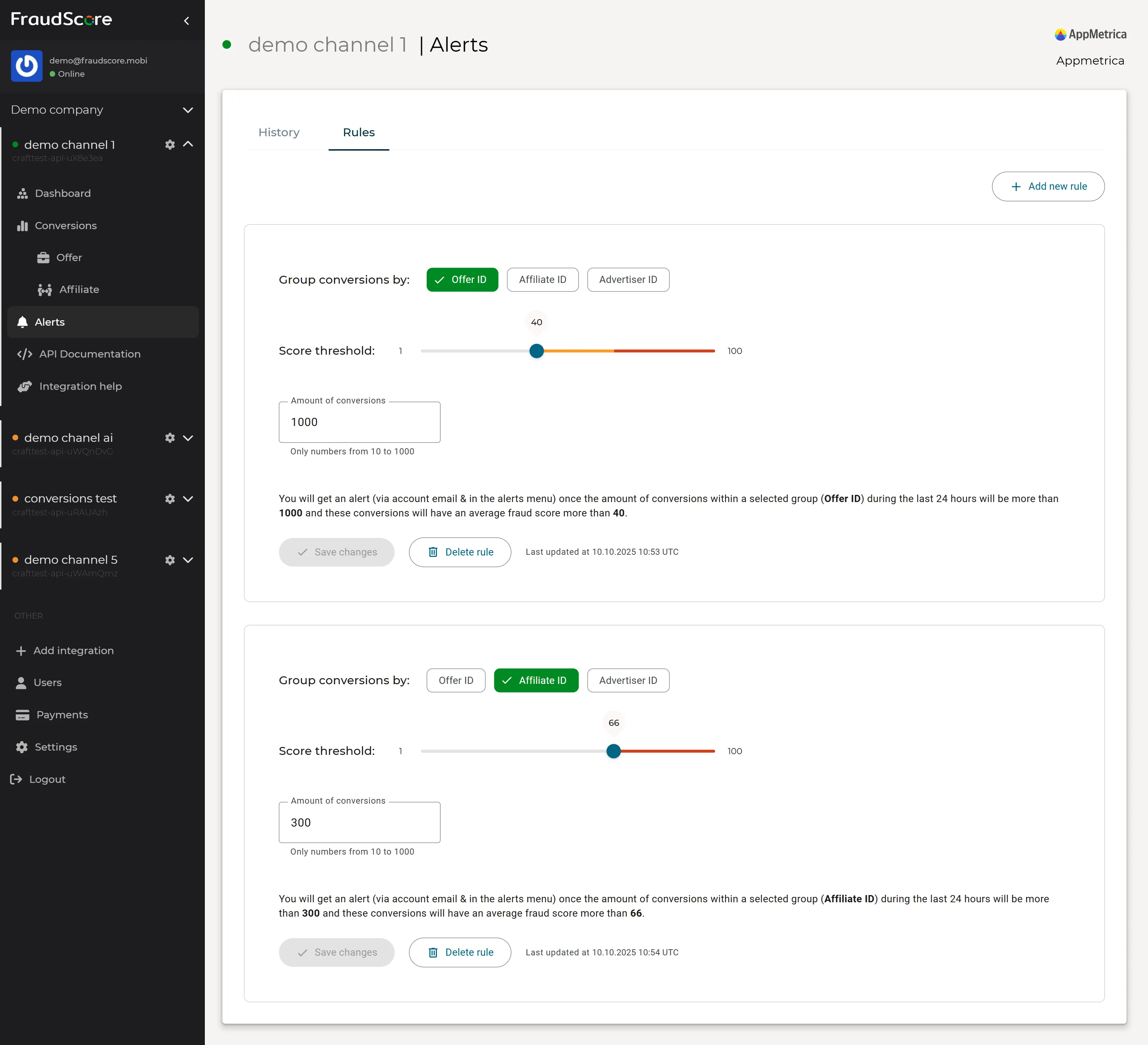Alerts позволяет получать уведомления, если fraudscore в выбранном срезе данных (например, по источнику или кампании) превышает заданный порог. Это избавляет от необходимости вручную отслеживать изменения.