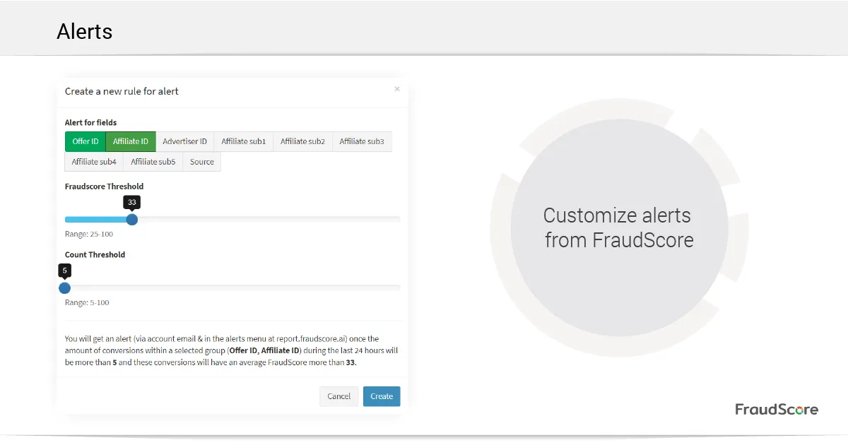 • Set the fraud score that is alarming. The FraudScore team always recommends digging into traffic when the fraud score is higher than 33.