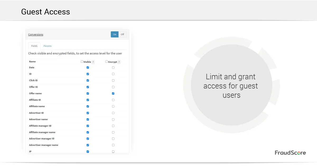 Imagine that you need to add a manager or partner to your FraudScore account in order to examine traffic quality reports. However, you don’t want to share all of the data and campaign information. That task is easily solved with the Guest Access feature. In your FraudScore account, you can create guest users and establish their data access rights: