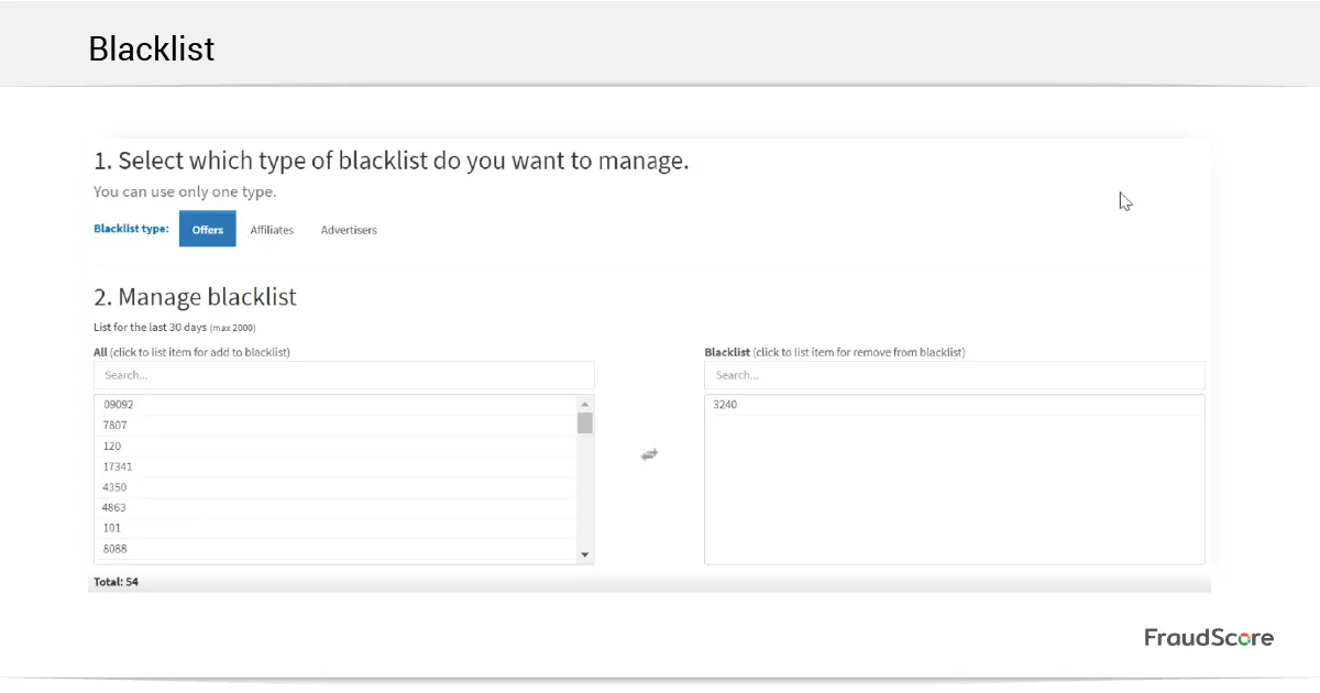 There is an option in the FraudScore account to blacklist and stop scoring traffic from certain affiliates, advertisers, or offers. This option means that you can stop FraudScore from scoring specific data: