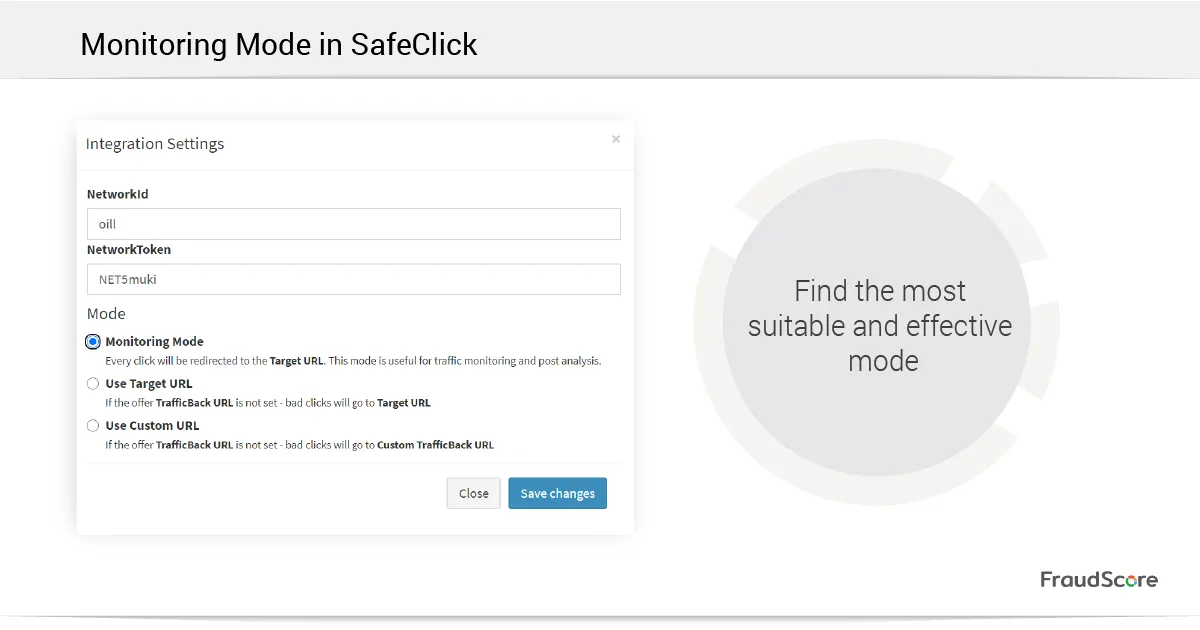 This mode might help you check the traffic quality of new affiliates and monitor existing campaigns. Additionally, Monitoring Mode is a great way to test the SafeClick solution without disturbing campaign traffic. You can try different settings and find the most suitable and effective mode for you.