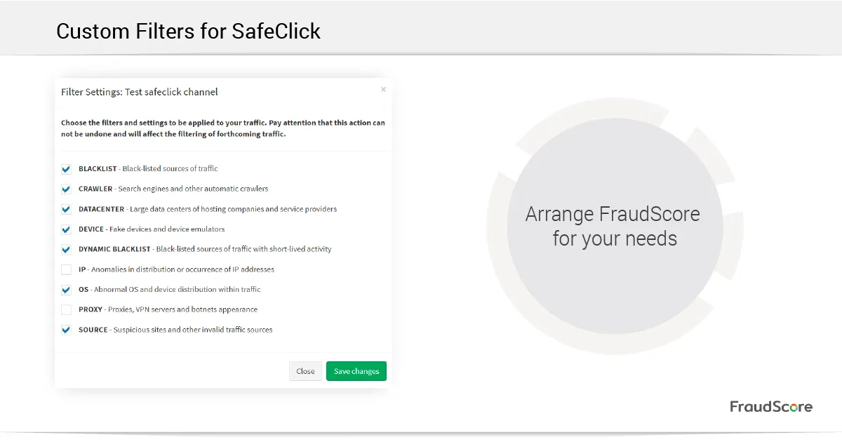 You can choose fraud filters that will be used for your click traffic analysis. This feature allows you to customize SafeClick settings according to your traffic peculiarities. You simply select the filters that you want to use for your click scoring: